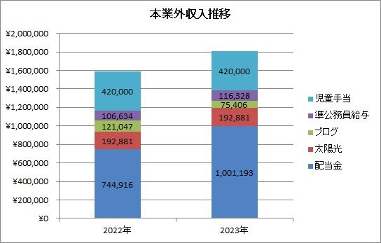 配当金は約100.1万円(概算)、太陽光は約19.2万円、ブログは約7.5万円、準公務員給与は約11.6万円、児童手当は42.0万円で、合計は約180.5万円となりました。