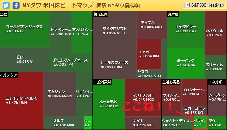 年初からダウ平均株価のヒートマップを見ていても、ずっと緑色が続いているんです。