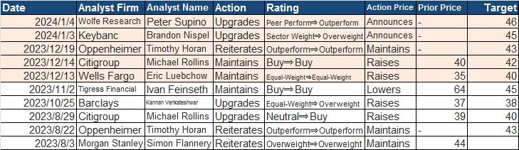 ご覧のように、年始早々にKeybancがSector Weight⇒Overweightに引き上げを行っており、目標株価を45ドルと設定しました。