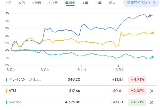 ちなみに下は年初来の株価推移ですが、ベライゾンは+4.7%、AT&Tは+2.3%、S&P500は-0.9%です。