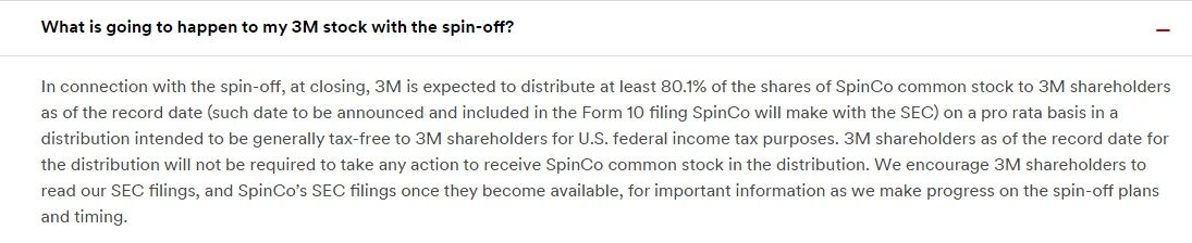 で、3Mのホームページで見つけたんですが、スピンオフでは3M株1株あたり、80.1%の新会社の株式が付与されるようです。