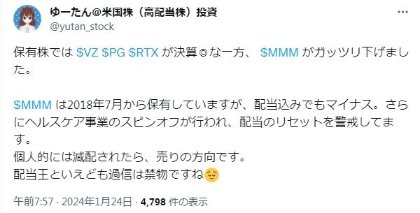 米国株グロガーのゆーたんさんは、「ヘルスケア事業のスピンオフが行われ、配当のリセットを警戒」し、「減配されたら、売りの方向」とのこと、、。