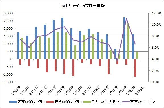 2023年11-24年1月期の決算発表は明日なので、2023年分は未記入ですが、キャッシュフローを確認すると、コロナ禍前と同水準にまで回復していることがわかります。