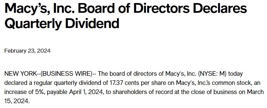 米百貨店大手のメーシーズ(M)は先日、第1四半期の配当を発表し、一株当たり17.37セント(0.1737ドル)とするとしました。これは従来の四半期配当に対して5%の増配となります。