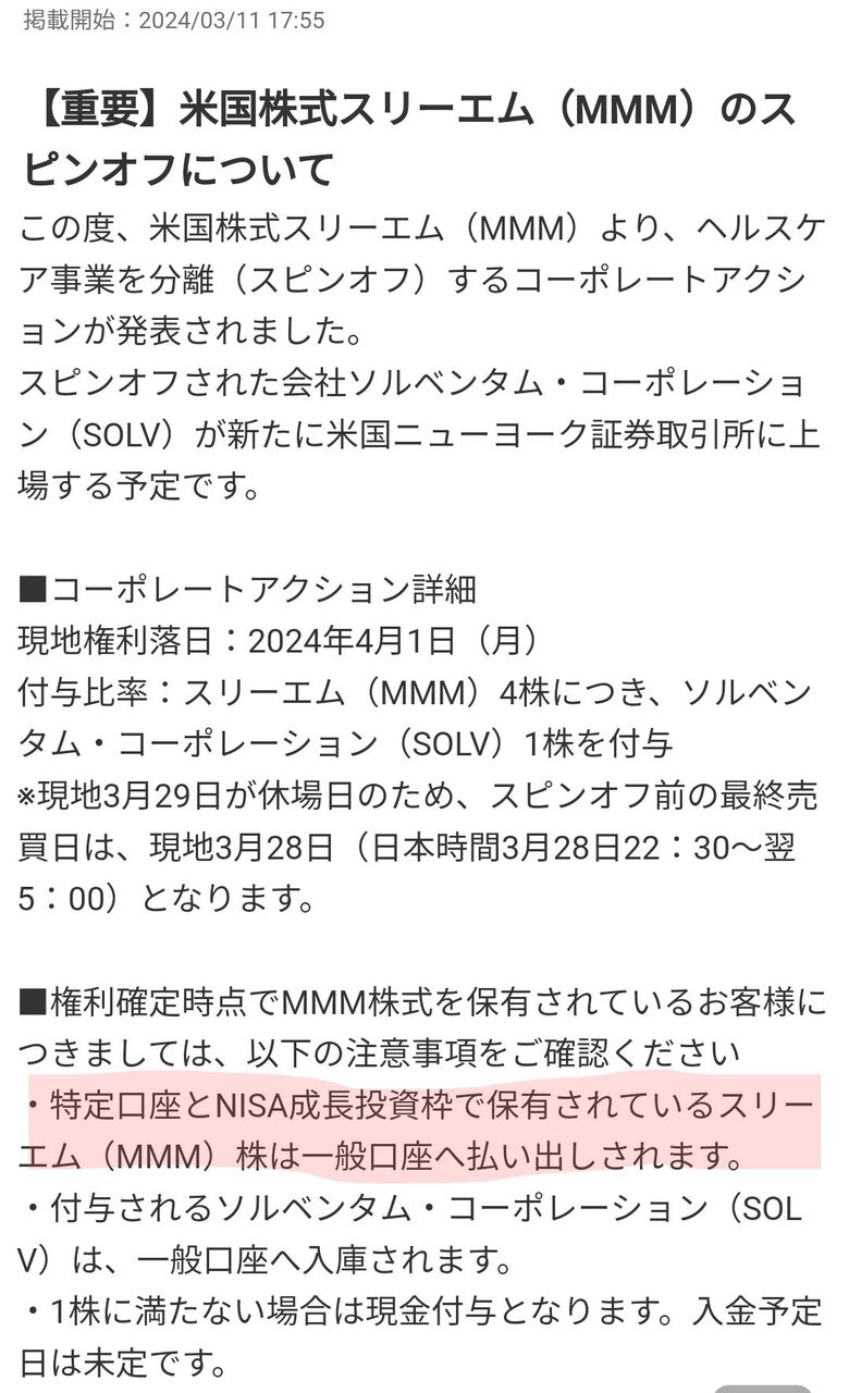 権利確定時点で保有する3M株は、特定口座だろうと、NISA口座だろうと、スピンオフ後は一般口座に払い出しされるとのことです。