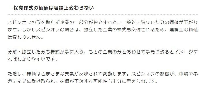 株価が下がるかなと思った理由は、企業が分離されるので、株式分割と同じでは?と思ったからです。しかし、今回はスピンオフ。理論上の価値は変わらないとのこと。