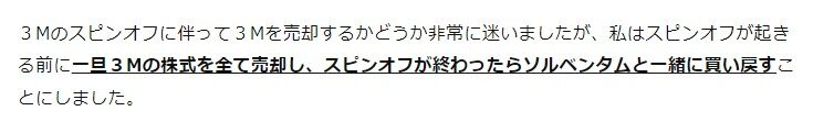 さて、米国株ブロガーのローンウルフさんはも、特定口座で保有する3M株を売却したと、ブログで公表してくれていました。そして、スピンオフが終わった後に3Mとソルベンタムを買い戻す予定だとも、仰っていました。