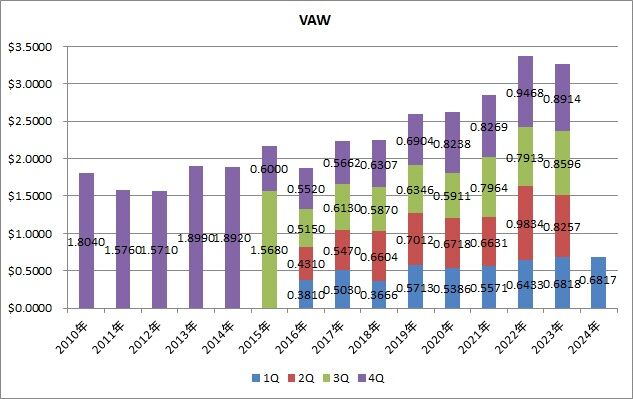 分配金は0.6817ドルで、前年同期比0.0%でした(厳密に言えば、0.0001ドル減)。1Qの平均増配率は11.4%でした。VAWは昨年年間で減配でしたので、今年増配に転換できるか注目です。