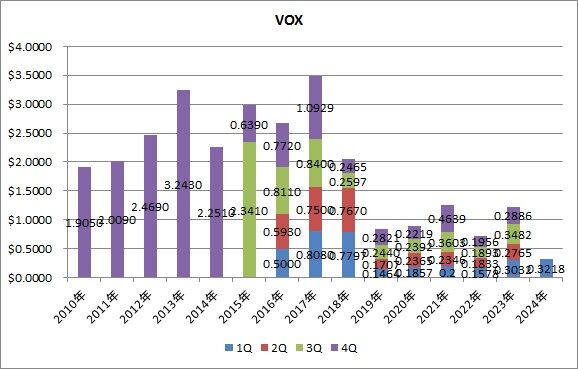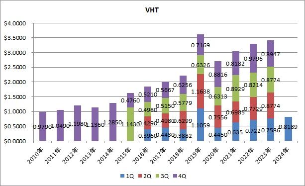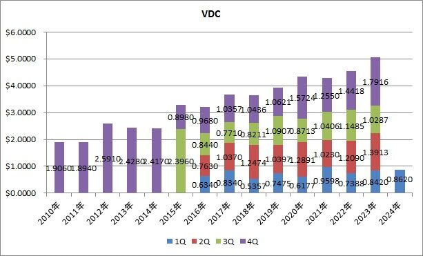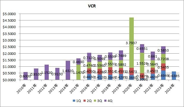 分配金は0.6385ドルで、前年同期比8.1%減配でした。1Qの平均増配率は40.3%でした。VCRは前回も減配でしたので、2四半期連続となります。