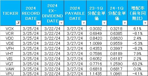 分配金は1.0961ドルで、前年同期比4.1%減配でした。1Qの平均増配率は5.8%でした。VPUは堅実に増配を続けていますので、今年もまだ増配は諦める必要ありませんね。