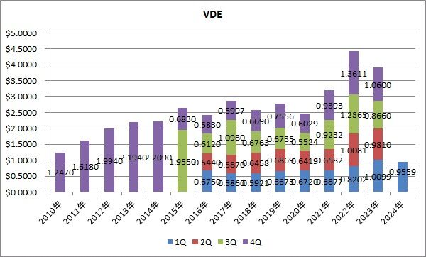 分配金は0.9559ドルで、前年同期比5.3%減配でした。1Qの平均増配率は6.6%でした。これでVDEの四半期分配金は4四半期連続で減配となっています。昨年は年間でも減配となっていました。