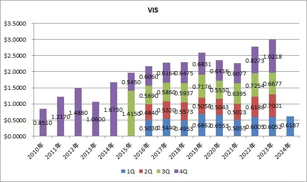 分配金は0.6187ドルで、前年同期比2.2%増配でした。1Qの平均増配率は4.3%でした。VISは2四半期連続での増配となりました。