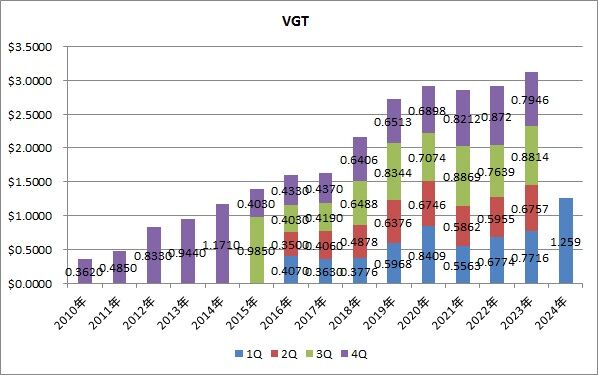 先ほども書いたように、VGTにとって最も高い増配率です。ただ連続増配の観点で言うと、前回は減配でしたので、増配に転換したとしか言えません。