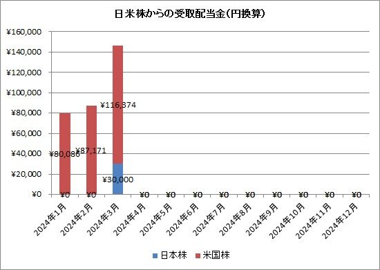 ということで、日本株から3万円、米国株から770.69ドルでした。米国株については円換算(1ドル=151円)しますと、約11.6万円です。合計すると、14.6万円となります。