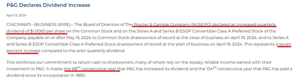 プロクター&ギャンブル(PG)が5月支払の四半期配当を1.0065ドルに増配すると発表しました。