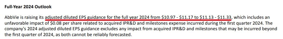 2024年通期の見通しですが、アッヴィは調整後一株利益を従来の10.97~11.17ドルから11.13~11.33ドルへと引き上げました。