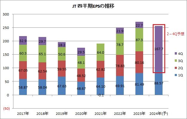 もう分かりますよね?JTは1~3Q(1-9月)で年間一株利益の大半を稼いでいて、4Q(10-12月)はほとんど貢献ないのです。場合よっては、マイナスになることも(2021年4Q)。