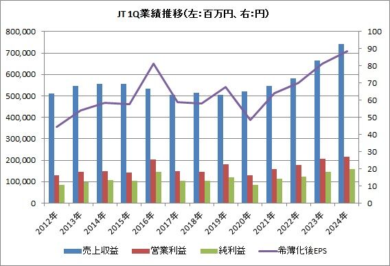 日本たばこ産業(JT)が2024年1-3月期の決算を発表しました。内容は良かったです。