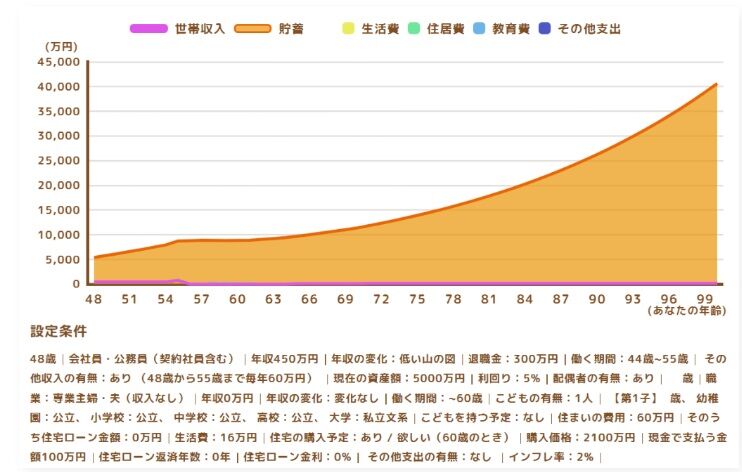 スタート時点(40歳)で貯蓄額7000万円というのが、かなりのアドバンテージとなっていると思います。ちなみに運用利回りはどちらも2%と控えめに設定していました。