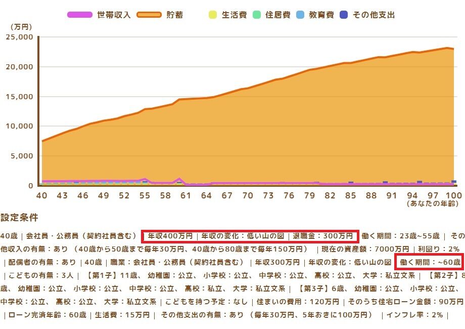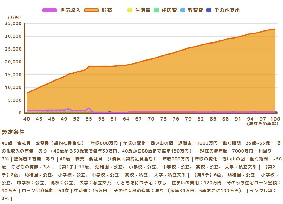 なんと、60歳前後で貯蓄額が2億円に迫り、100歳時点で3億円を超える結果に、、w(゚o゚)w オオー!