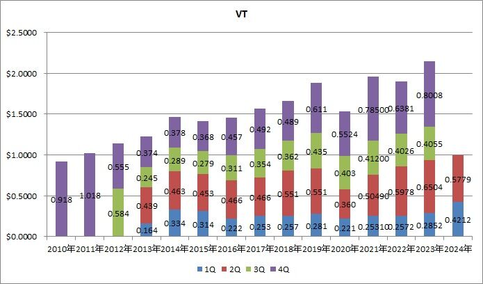 分配金は0.5779ドルでした。VYMと対照的に前年同期比11.1%減配となっています。VTの四半期分配金の減配は2022年12月以来のことです。