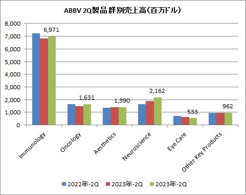 主力のImmunologyは69.71億ドル(前年同期比2.3%増)、Oncologyは16.31億ドル(同10.4%増)、Aestheticsは13.90億ドル(同0.4%増)、Neuroscienceは21.62億ドル(同14.7%増)などです。