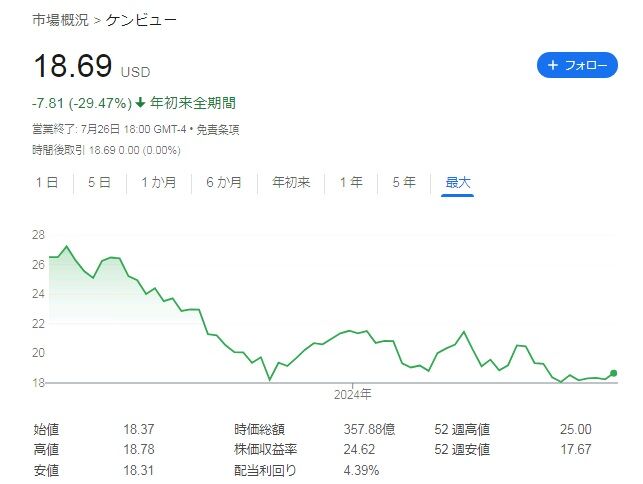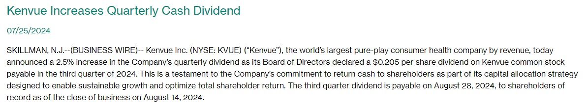 「売上高で世界最大の消費者ヘルスケア企業でケンビューは2024年第3四半期の普通株に対する配当を0.205ドルとし、2.5%増配することを取締役会で宣言した」と、、。