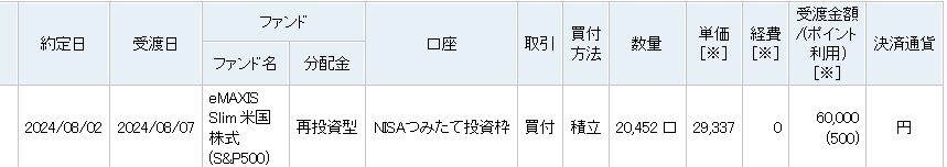 そして、これは毎月のことですが、新NISAのつみたて枠を使って6万円分の投信を買っています(自動積立)。