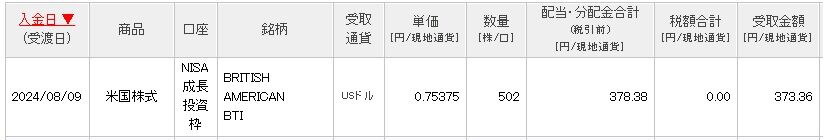 前回の単価は0.73485ドルだったので、2.5%ほど増配になっていて、かつ保有数量も387株から115株も増やしていて、しかもADRだし、NISA口座保有だから、国内外の税金がゼロ。これで373ドルを達成ときた(口座管理手数料が5ドルほどある)。