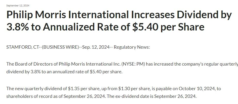 たばこ大手のフィリップ・モリス・インターナショナル(PM)が増配を発表しました。