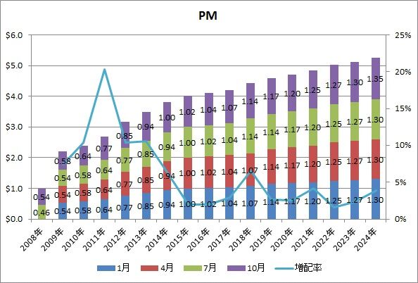 増配率3.8%%というのは、ここ5~6年で2番目に高い水準で、2023年の2.4%増や2022年の1.6%を上回るものです。増配率が2年連続で上昇するなんて、PMにとって珍しいです。
