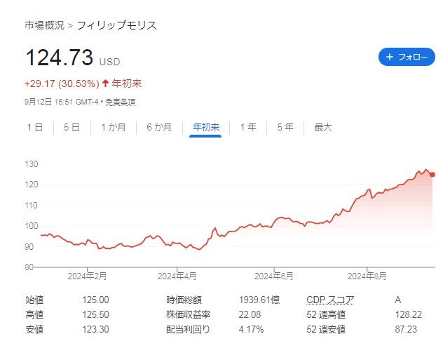 現在の株価は124.73ドル。年初来では30%も上昇していまして、過去最高値付近なんですよね。たばこ株にはここまでの株価上昇に期待していないので、ちょっと待ってくれ!って思っちゃいます。