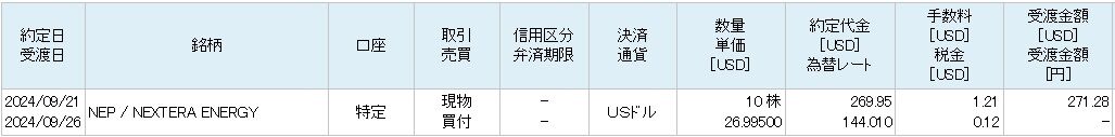 単価26.995ドルで10株、受渡代金は271.28ドルでした。4000万円のポートフォリオからすれば、271ドルなんてほぼ無いに等しいですが、、、。まずは買ったということが大事です。