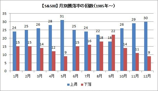 これにより1985年以降の月次騰落回数では、ダウ平均株価とS&P500指数はともに上昇が29回、下落が11回となりました。