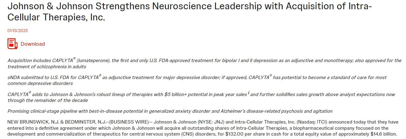 また今回の買収がジョンソン・エンド・ジョンソンの業績に与える影響については、2025年通期ガイダンスとして、1/22の決算発表で行われるようです。どんな数字が出てくるでしょうかね、、。