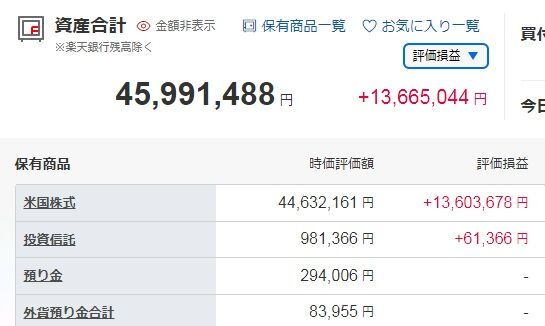 資産評価額の内訳は、米国株式が4.463.2万円(同2.6%増)、投資信託が98.1万円(同3.6%増)、預り金が29.4万円、外貨預り金は8.3万円でした。