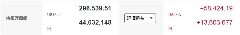 資産評価額は296,539.51㌦(前月末比6%増)、評価損益は+58,424.19㌦(同32%増)でした。ドルベースでの資産評価額と評価損益は過去最高となっています。
