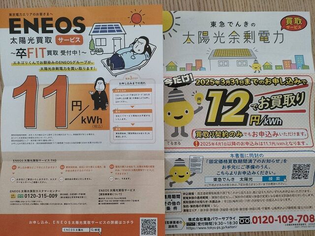 東電からのお知らせには、ENEOSや東急でんきの電力のチラシも入っていました。前者は単価11円、後者は12円で買い取ってくれるそうです。これだけ見ると、東急でんきが良いかなって思ってしまいますね。少しでも高く売りたいですからね。