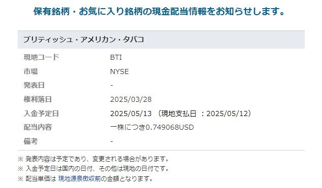 先日、ブリテッシュ・アメリカン・タバコ(BTI)の増配についてお知らせしました。先日のはポンドベースの金額でしたね。