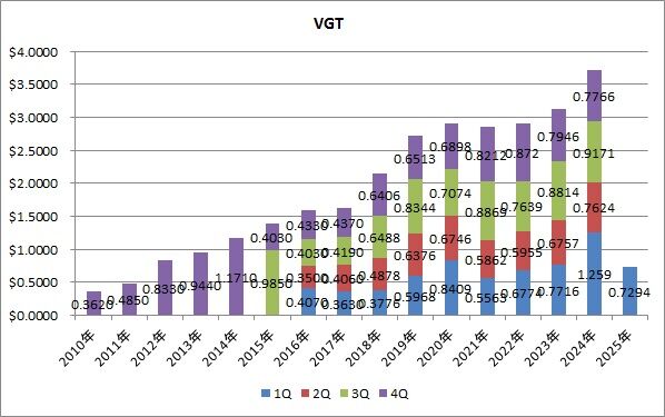 単価は1.2275㌦で前年同期比12.0%増でした。年間分配金は3年連続で増配中です。昨年の年間分配金は4.9281㌦で、VDCの4.9293㌦に次いで2番目に多いセクターETFとなりました。