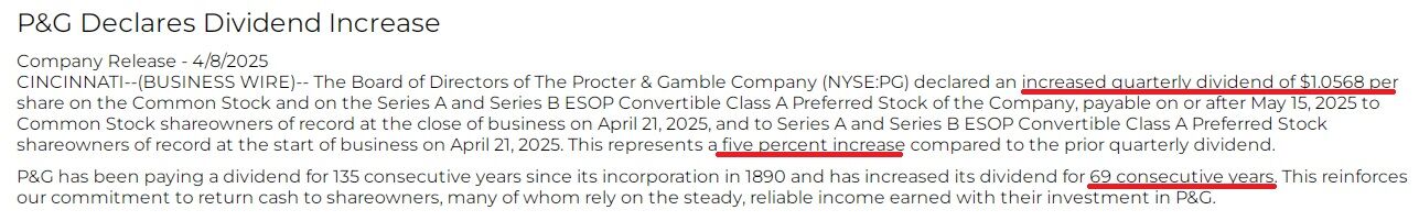 かつプロクター&ギャンブルが創業してから135年間連続しての配当支払となります。135年間って凄いですね。135年前って、一体いつよ、、。