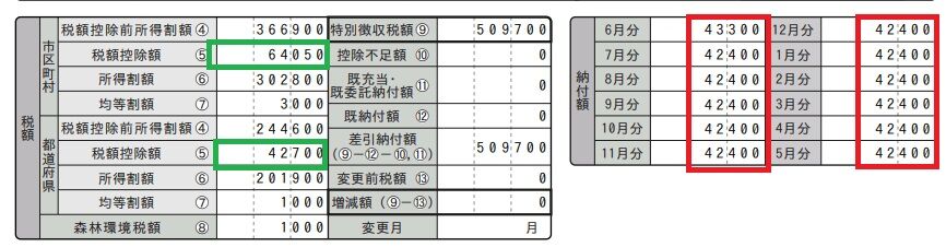 6月が43,300円、7月以降が42,400円、、で合計は509,700円也(左側の差引納付額と同額)。