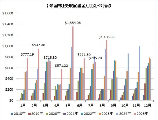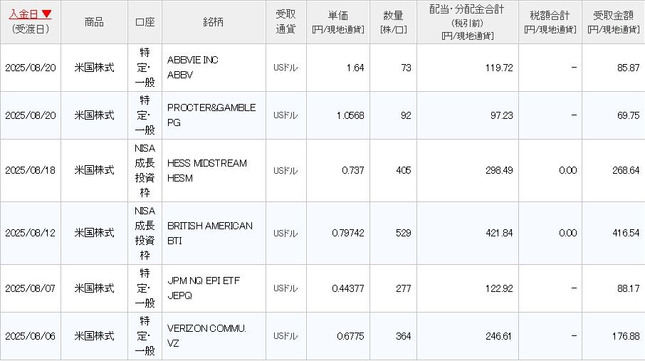 BTI、HESM、VZなどの高配当株に加え、NISA(非課税口座)での保有による効果もあり、8月は受取額が多くなる傾向にあります。8月は6銘柄から合計で1,105.85ドルでした。