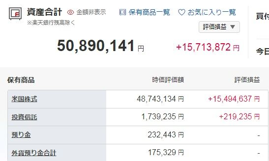 資産額の内訳は、米国株式が48,743,134円(前月末比0.4%増)、投資信託が1,739.235円(同7.0%増)、預り金が232,443円、外貨預り金は175,329円でした。