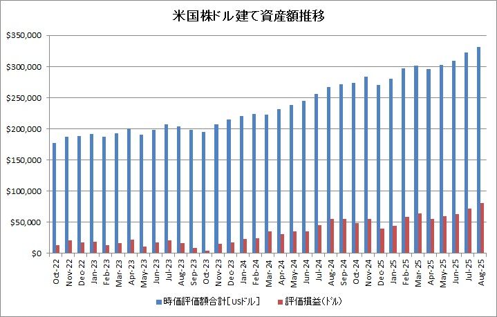 評価額は331,653.63ドル(前月末比3.0%増)、評価損益は+80,512.90ドル(同12.7%増)となっており、円ベースより伸びが良好でした。