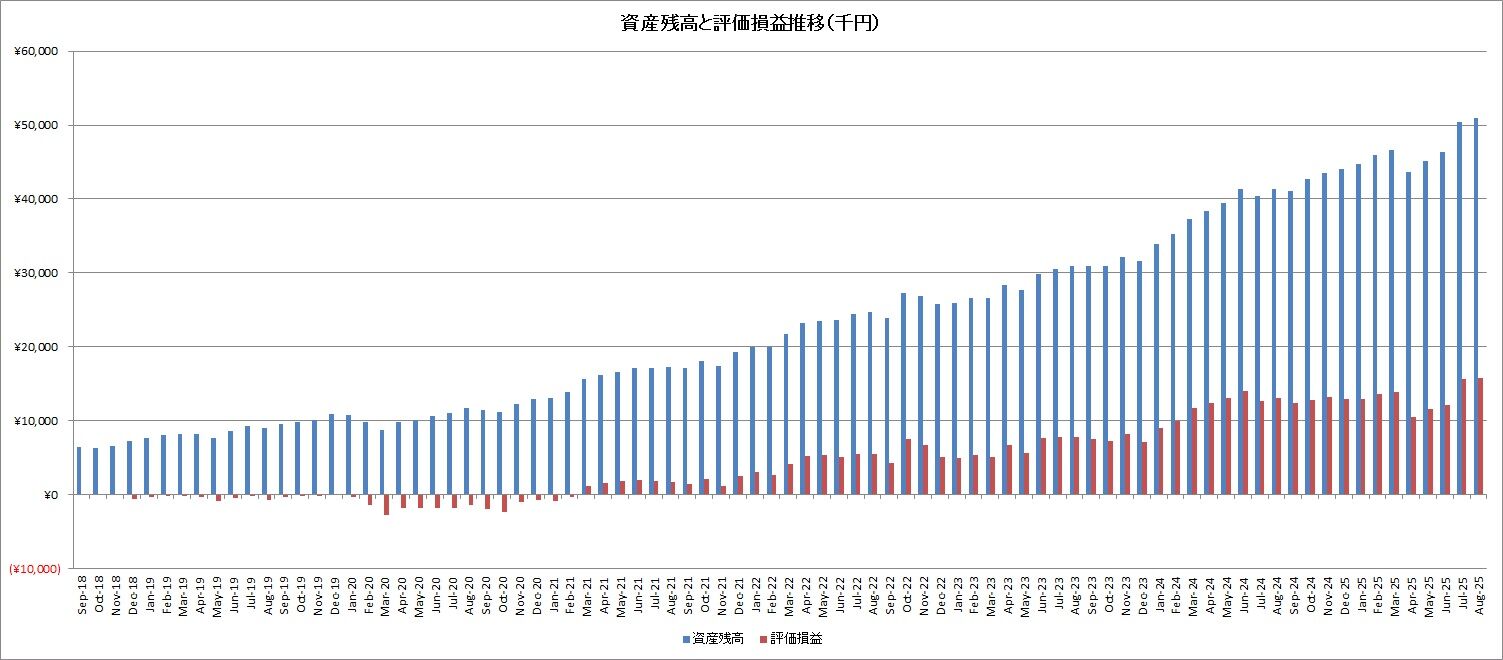 円ベースの資産額と評価損益の推移は以下の通りです。順調に増えている様子が分かります。