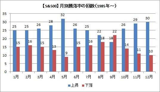 こちらはS&P500指数です。上昇18回、下落22回で、年間で唯一9月が下落が上回る月となっています。