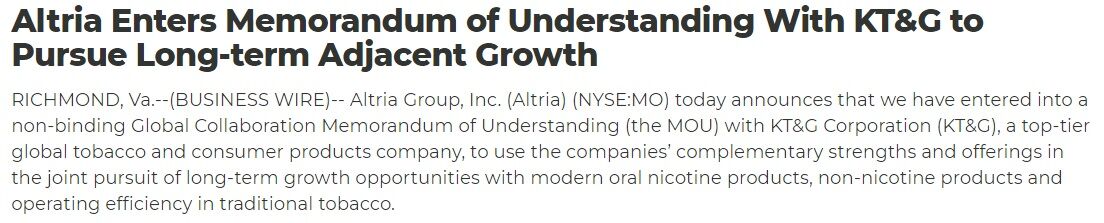 これはアルトリアとKT&G双方が発表したことですが、前者による文書によれば、長期的に本業に密接に関連する分野への成長投資に関するものとのことで、具体的には経口ニコチン製品、非ニコチン製品分野での長期的な成長と従来のたばこ製品での効率的なオペレーションを目指すものです。