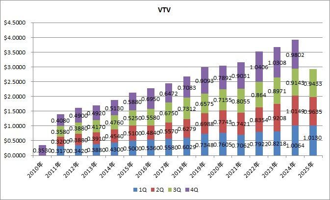 1Q~3Q累計分配金は5.2968ドルで、前年同期の4.9650ドルを6.7%上回っています。年間でも増配が期待できそうなペースです。