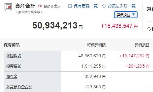 内訳は、米国株式が48,560,620円(前月比末比0.4%減)、投資信託が1,911,295円(同9.9%増)でした。預り金は332,943円、外貨預り金は129,355円です。